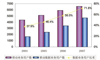 Verizon Wireless于2003年10月開通了北美首家EV-DO網(wǎng)絡(luò),2007年開始將網(wǎng)絡(luò)升級(jí)到EV-DO RevA,目前已有70%的網(wǎng)絡(luò)升級(jí)至EV-DO Rev A,CDMA網(wǎng)絡(luò)覆蓋約2億的美國(guó)人口。截至2007年底,Verizon Wireless業(yè)務(wù)收入達(dá)到439億美元,同比增長(zhǎng)15.3%,其中數(shù)據(jù)業(yè)務(wù)收入為74億美元,同比增長(zhǎng)了65%;凈利潤(rùn)38億美元,同比增長(zhǎng)27.5%;移動(dòng)用戶數(shù)為6570萬(wàn),同比增長(zhǎng)11.3%,其中移動(dòng)數(shù)據(jù)用戶為4720萬(wàn)戶,占移動(dòng)用戶數(shù)的74%,同比增長(zhǎng)37%;同時(shí)離網(wǎng)率最低,僅為1.2%。2004~2007年Verizon Wireless用戶發(fā)展情況和業(yè)務(wù)收入發(fā)展情況分別如圖6和圖7。