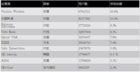 表2 全球CDMA運(yùn)營(yíng)商排名(截止到2008年一季度) 來(lái)源:Wireless Intelligence