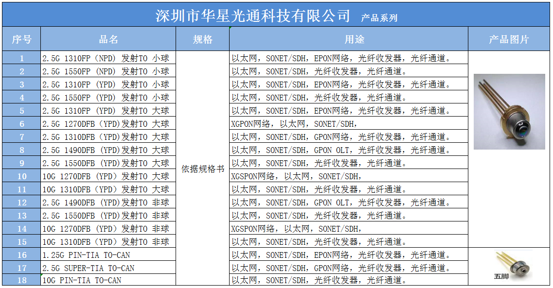 目前深圳華星光通主營產(chǎn)品包括:1.應(yīng)用于接入網(wǎng)、無線網(wǎng)、通信網(wǎng)和數(shù)據(jù)中心等領(lǐng)域的1.25Gbit/s ,2.5Gbit/s ,10Gbit/s,25Gsbit/s等發(fā)射TO和接收TO;2.其它領(lǐng)域所需的功率TO。