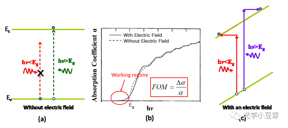 Ge材料在O波段和C波段都有較大的吸收系數(shù),這也是為什么硅光芯片中采用Ge作為光探測(cè)器。而Ge材料作為電吸收調(diào)制器,主要是基于Franz-Keldysh效應(yīng)(以下簡(jiǎn)稱FK效應(yīng))。在外加電場(chǎng)作用下,能帶發(fā)生傾斜,使得有效的帶隙變小,價(jià)帶電子躍遷到導(dǎo)帶的幾率大大增加。