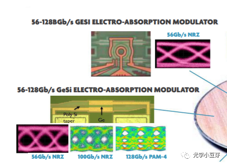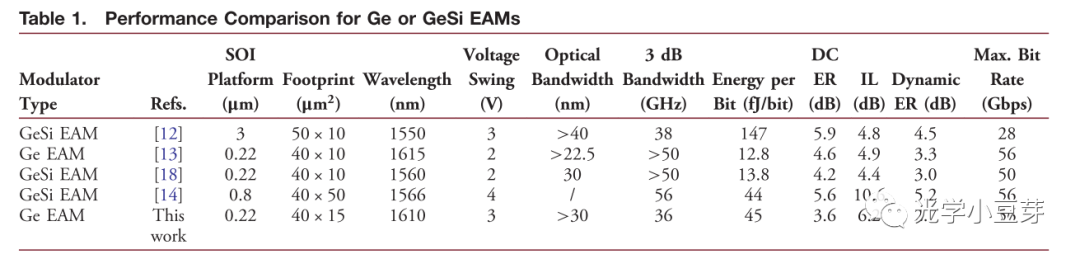 從上表可以看出,Ge EAM的尺寸非常小,長(zhǎng)度只需要幾十微米,工作波長(zhǎng)在1550nm以上,其工作電壓在3V左右,3dB帶寬可以達(dá)到56GHz,功耗較低。因此小豆芽覺(jué)得,對(duì)于大規(guī)模集成光路,對(duì)單個(gè)器件的尺寸與功耗要求比較高,此時(shí)EAM或許有用武之地。
