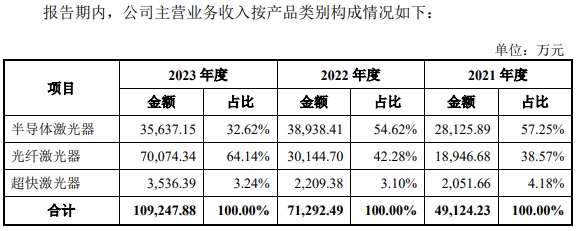 公司 2024 年半年度預(yù)計實現(xiàn)營業(yè)收入 6.12 億元至 7.48 億元左右,較 2023 年同期預(yù)計增長幅度為 10.46%至 35.01%,預(yù)計實現(xiàn)扣除非經(jīng)常性損益后的歸 屬于母公司股東的凈利潤為 6,500 萬元至 8,000 萬元,預(yù)計增長主要來源于光纖 激光器收入的持續(xù)增長。2021年-2023年,發(fā)行人的營業(yè)收入分別為 49,632.08 萬元、72,165.33 萬元和 110,448.88 萬元。