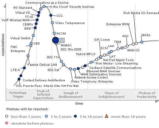 *此圖表為 Gartner2009 年發(fā)布的對于電信行業(yè)技術(shù)的評估曲線. 其中對于IPv6 做了標(biāo)準(zhǔn).