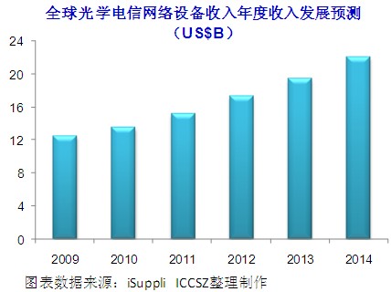 市場研究公司iSuppli的研究表明,2010年,全球光學(xué)電信網(wǎng)絡(luò)設(shè)備的收入將達到135億美元,較2009年的125億美元增長7.7%。在未來的四年中,收入將繼續(xù)上升,并將于2014年增至221億美元。這一數(shù)字僅次于2000年249.5億美元的市場峰值水平。雖然這一部分的收入曾在2006 年和2007年短暫飆升,但這一上升的勢頭未能持續(xù),而在隨后的2008和2009年,市場再次回落至較低水平。