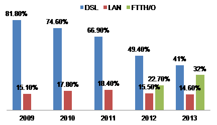 ICCSZ訊 近年來隨著國家加大對(duì)電信基礎(chǔ)設(shè)施的建設(shè),我國電信業(yè)有了較大的發(fā)展,尤其是FTTH/O在2012年和2013年實(shí)現(xiàn)大幅度增長(zhǎng),從2012年互聯(lián)網(wǎng)寬帶接入端口技術(shù)比例為22.7%,到2013年提升到32%,而DSL則出現(xiàn)大幅度下降。