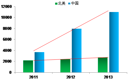 圖一表明我國光進(jìn)銅退正在快速的進(jìn)行中,而圖二則列出的是中國地區(qū)與北美地區(qū)FTTH覆蓋數(shù)對(duì)比情況:從2011年到2013年FTTH覆蓋數(shù)中國分別是北美地區(qū)的1.68倍、3.09倍和4.15倍。
