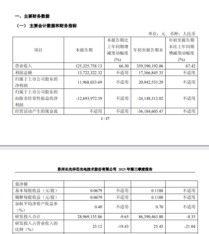 ICC訊 長(zhǎng)光華芯披露2025年第三季度報(bào)告,公司前三季度實(shí)現(xiàn)營(yíng)收3.39億元,同比增長(zhǎng)67.42%;歸母凈利潤(rùn)2094萬元,同比扭虧為盈。其中第三季度公司實(shí)現(xiàn)營(yíng)收1.25 億元,同比增長(zhǎng) 66.3%;實(shí)現(xiàn)歸母凈利潤(rùn)1197萬元,同比扭虧。業(yè)績(jī)?cè)鲩L(zhǎng)主要是公司市場(chǎng)拓展較好,下游需求開始有所復(fù)蘇,公司高功率產(chǎn)品收入增長(zhǎng)。此外,公司前期布局的光通信等業(yè)務(wù)獲得終端客戶認(rèn)可并實(shí)現(xiàn)批量出貨,有望成為公司第二增長(zhǎng)曲線。