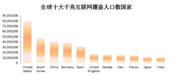 分國家來看,美國仍然是千兆互聯網人口覆蓋數最多的國家,現有超過8048萬人可以連接千兆寬帶。其次是韓國的4692萬,中國的4125萬、德國的3882萬和西班牙的3245萬。目前覆蓋人口數上千萬的國家有11個。除了前五大之外,還有英國、加拿大、意大利、法國、日本和印度。