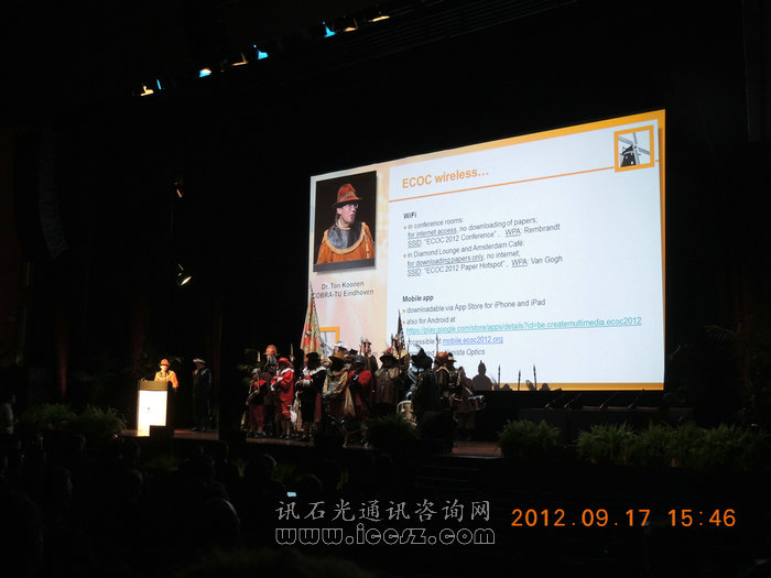 本次展會所在地AMSTERDAM RAI展館,本屆ECOC展在第一層,所以相比往年還有兩層的展館,今年的展覽面積似乎縮小了。展館遠(yuǎn)望去都是玻璃結(jié)構(gòu)為主,真正的用途卻是“節(jié)能、環(huán)保”,在展館開放的時候,館內(nèi)的燈光逐步暗下來,整個展館借助屋頂?shù)牟A?,利用太陽光來照明,非常環(huán)保。尤其到中午時分,絲絲陽光灑落下來,整個展館既明亮又溫暖。 參加ECOC2012開幕式,給人耳目一新的感覺,這在國內(nèi)是不多見的,沒有場面宏大的典禮現(xiàn)場,也沒有衣著正式的干部領(lǐng)導(dǎo),在舞臺上開幕的主持人著裝是如此“怪異”,舞臺后的團(tuán)隊是開幕表演的皇家樂隊。但這樣的開幕似乎更吸引人眼球,而關(guān)于展會的實用信息(展館介紹,研討會安排,無線網(wǎng)絡(luò)使用等)一應(yīng)俱全,一一介紹。