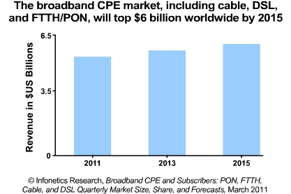 *全球?qū)拵в脩艚K端設(shè)備市場,包括DSL、電纜和FTTH設(shè)備,在2010年達到52億美元,預(yù)計該市場到2015年將增長至60億美元。