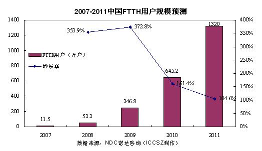 諾達(dá)咨詢《2008FTTH(光線到戶)產(chǎn)業(yè)發(fā)展與市場(chǎng)機(jī)遇研究報(bào)告》市場(chǎng)調(diào)研數(shù)據(jù)認(rèn)為,無(wú)論是客戶群還是設(shè)備市場(chǎng)規(guī)模,我國(guó)FTTH的發(fā)展都已經(jīng)到了迅速發(fā)展的臨界點(diǎn)。雖然08年仍無(wú)法實(shí)現(xiàn)大規(guī)模、“井噴式”增長(zhǎng),但可以預(yù)期的是,09年將是FTTH真正在市場(chǎng)上呼風(fēng)喚雨的時(shí)刻。