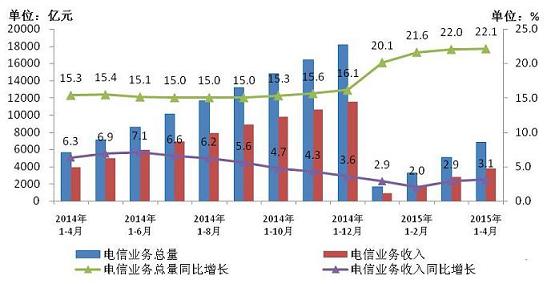 2015年1-4月,電信業(yè)務(wù)總量完成6887.5億元,同比增長22.1%,繼續(xù)保持加速增長趨勢。電信業(yè)務(wù)收入完成3746.2億元,按可比口徑測算同比增長3.1%,比1-3月提高0.2個百分點,繼續(xù)顯現(xiàn)回升態(tài)勢。