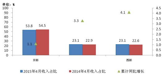 圖10 2015年4月東、中、西部電信主營業(yè)務(wù)收入同期比較