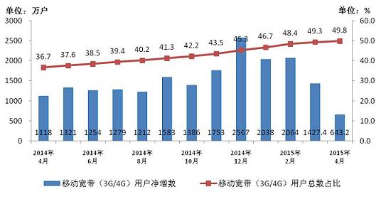 圖2.2014-2015年4月移動寬帶用戶當月凈增數(shù)和總數(shù)占比情況