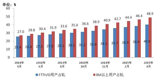 圖3 2014-2015年4月光纖接入FTTH/O和8Mbps及以上寬帶用戶占比情況