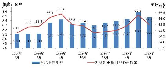 圖4 2014-2015年4月手機上網(wǎng)用戶和對移動電話用戶滲透率情況