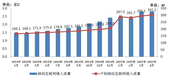 圖7 2014-2015年4月移動互聯(lián)網(wǎng)接入流量和戶均流量比較