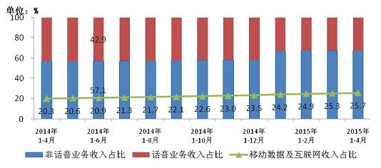 圖9 2014-2105年4月話音、非話音、移動數(shù)據(jù)及互聯(lián)網(wǎng)收入占比情況