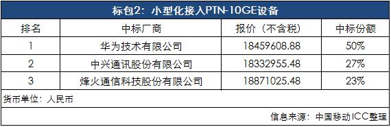 ICC訊 10月28日,中國移動發(fā)布2022年至2023年小型化接入PTN設(shè)備集中采購(標(biāo)包2)的中標(biāo)結(jié)果,華為、中興通訊和烽火通信3家中標(biāo)。