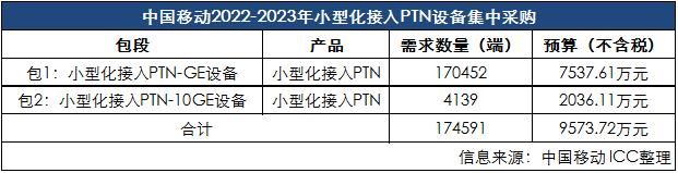 據(jù)中國移動集采文件公告,本次小型化接入PTN設(shè)備預(yù)估為17.46萬端,項目總預(yù)算9573.72萬元(不含稅)。項目劃分為2個標(biāo)包,具體標(biāo)包劃分及分配份額如下: