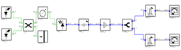 關于線性度,利用pLogic搭建鏈路如下圖所示,使用兩個連續(xù)激光器(CWL_1、CWL_ 2)作為光源發(fā)射到2x2定向耦合器(C_1)中。為了產(chǎn)生拍頻,在兩個連續(xù)激光器之間施加一點頻率差。通過C_1后,光衰減器(ATT_1)用于衰減光功率。Pin光電檢測器(Pin_1)用于檢測接收信號并將信號類型從光信號轉(zhuǎn)換為電信號(O-E轉(zhuǎn)換)。DC塊(HPF_1)用于濾除低頻噪聲。電放大器(AMP_1)用于增強光功率并產(chǎn)生一階/三階非線性效應。電叉(fork_1)用于將信號從一個端口分離到兩個端口。最后,使用兩個矩形帶通濾波器(BPF_1、BPF_ 2)分別濾除一階和三階信號。兩個功率表(PWM_1、PWM_2)用于測量電功率。