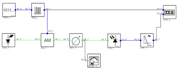 關于靈敏度, 如下圖所示偽隨機比特序列(PRBS_1)和不歸零碼(NRZ_1),用于產(chǎn)生隨機通斷鍵控(OOK)信號。經(jīng)過NRZ_1后,一部分信號發(fā)送給眼圖作為參考信號,另一部分作為接收信號發(fā)送到光幅度調(diào)制器(AM_1),通過整個系統(tǒng)到達眼圖。連續(xù)波激光器(CWL_1)作為光源發(fā)射到光幅度調(diào)制器的光端口。光衰減器(ATT_1)用于衰減光功率。光功率計(OPWM_1)用于監(jiān)測光功率。信號調(diào)制后,pin探測器(pin_1)用于將信號從光信號轉(zhuǎn)換為電信號。低通貝塞爾濾波器(LPF_1)用于濾除高頻信號。最后,利用眼圖分析傳輸信號的質(zhì)量。