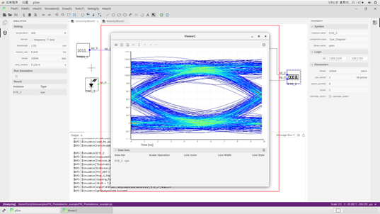 關于靈敏度,同樣在 pLogic 中連接器件調(diào)用 pSim 進行仿真如下圖。眼圖結果表明判決瞬間為5.47 ns,門限電平為0.68 uV,消光比為16.03 dB,眼圖開度為0.86,眼寬為7.43 ns,最小誤碼率為2.20e-12,最大Q因子為6.92。
