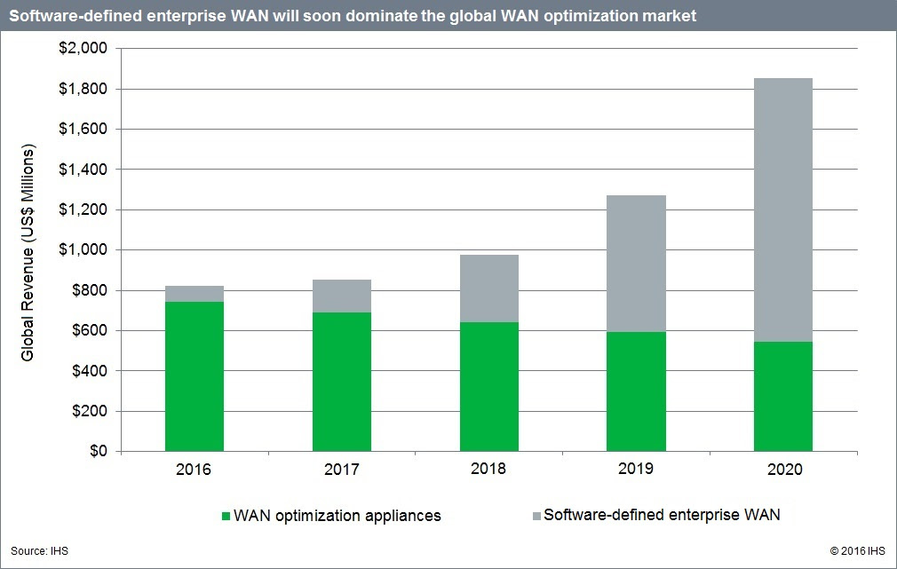 IHS分析師預(yù)計到2018年,SD-WAN市場發(fā)展速度將會放緩,隨后到2020年會有更多的企業(yè)采用SD-WAN。預(yù)計到2020年,將會占到廣域網(wǎng)優(yōu)化收入的71%。
