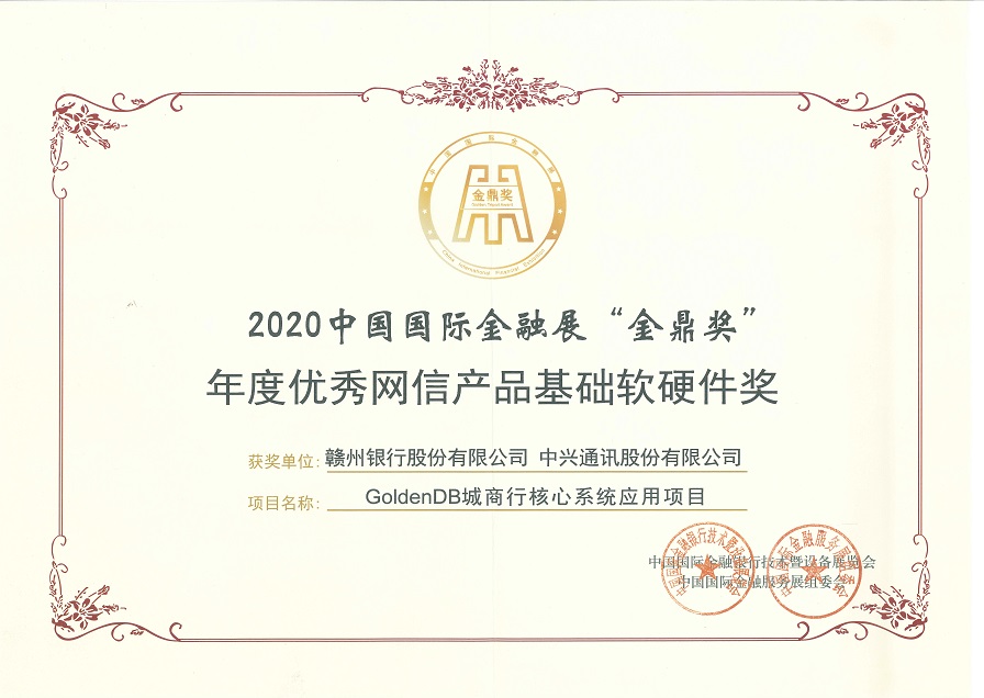 ICC訊 近日,中國國際金融展組委會正式公布2020 “金鼎獎”獲獎單位名單,中興通訊攜手贛州銀行打造的“GoldenDB城商行信貸核心系統(tǒng)應用項目”喜獲“年度優(yōu)秀網(wǎng)信產(chǎn)品基礎(chǔ)軟硬件獎”,這是繼2019年攜手中信銀行之后再次獲此殊榮,充分展現(xiàn)了GoldenDB分布式數(shù)據(jù)庫在金融行業(yè)的創(chuàng)新實力。