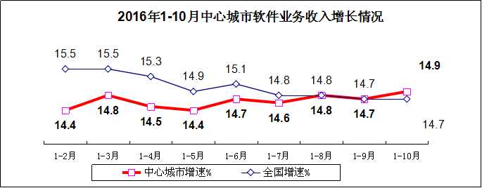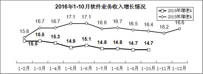 軟件業(yè)務(wù)收入保持較快增長。1-10月,我國軟件和信息技術(shù)服務(wù)業(yè)完成軟件業(yè)務(wù)收入39073億元,同比增長14.7%,增速同比回落1.7個百分點。其中,10月軟件業(yè)務(wù)收入增長15.2%,比9月提高1.9個百分點。