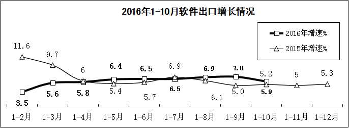 出口增長快于去年同期,但10月份同比出現(xiàn)下降。1-10月,軟件業(yè)實現(xiàn)出口402億美元,同比增長5.9%,增速同比提高0.7個百分點。10月,軟件出口同比下降3.3%,出現(xiàn)今年以來首次下滑,其中外包服務(wù)出口下滑14.1%,嵌入式系統(tǒng)軟件出口增長2.5 %,比9月下滑了7個百分點。