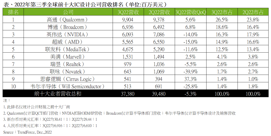 高通(Qualcomm)、博通(Broadcom)、英偉達(dá)(NVIDIA)、AMD、聯(lián)發(fā)科(MediaTek)位列 2022 年第三季全球 IC 設(shè)計(jì)廠商營(yíng)收排行前五位。