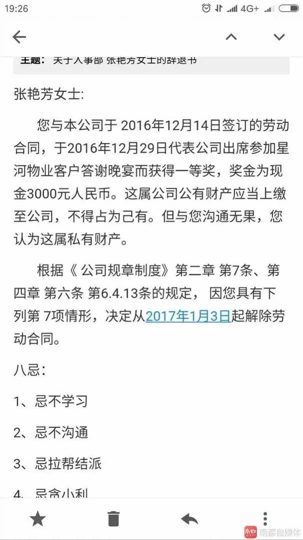 1月3日,博奧特公司行政部給張艷芳發(fā)了一封辭退郵件。郵件里稱,參加答謝會(huì)而獲得的一等獎(jiǎng)3000元屬于公司公有財(cái)產(chǎn),應(yīng)該上繳,不得占為己有。
