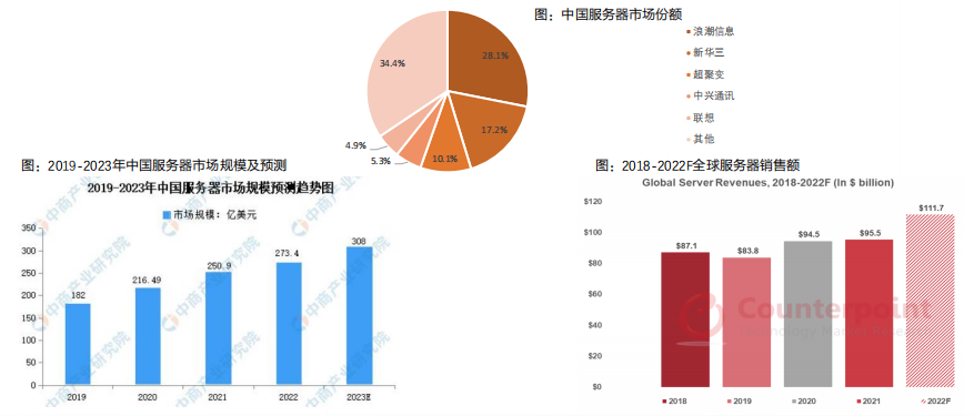 服務(wù)器市場(chǎng)規(guī)模持續(xù)增長(zhǎng)。根據(jù)Counterpoint的全球服務(wù)器銷(xiāo)售跟蹤報(bào)告,2022年,全球服務(wù)器出貨量將同比增長(zhǎng)6%,達(dá)到1380萬(wàn)臺(tái)。收入將同比增長(zhǎng)17%,達(dá)到1117億美元。根據(jù)IDC、中商產(chǎn)業(yè)研究院,我國(guó)服務(wù)器市場(chǎng)規(guī)模由2019年的182億美元增長(zhǎng)至2022年的273.4億美元,復(fù)合年均增長(zhǎng)率達(dá)14.5%,預(yù)計(jì)2023年我國(guó)服務(wù)器市場(chǎng)規(guī)模將增至308億美元。