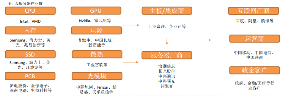 CPU主要供貨廠商為Intel、GPU目前領(lǐng)先廠商為國(guó)際巨頭英偉達(dá),以及國(guó)內(nèi)廠商如寒武紀(jì)、海光信息等。