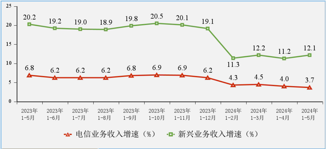 電信業(yè)務(wù)收入增速放緩,電信業(yè)務(wù)總量保持兩位數(shù)增長。1—5月份,電信業(yè)務(wù)收入累計完成7387億元,同比增長3.7%,增速較1—4月份回落0.3個百分點(diǎn)。按照上年不變價計算的電信業(yè)務(wù)總量同比增長11.9%。