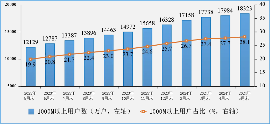 固定寬帶接入用戶規(guī)模穩(wěn)步增加,千兆用戶數(shù)持續(xù)擴(kuò)大。截至5月末,三家基礎(chǔ)電信企業(yè)的固定互聯(lián)網(wǎng)寬帶接入用戶總數(shù)達(dá)6.52億戶,比上年末凈增1534萬戶。其中,100Mbps及以上接入速率的固定互聯(lián)網(wǎng)寬帶接入用戶達(dá)6.17億戶,占總用戶數(shù)的94.6%;1000Mbps及以上接入速率的固定互聯(lián)網(wǎng)寬帶接入用戶達(dá)1.83億戶,比上年末凈增1996萬戶,占總用戶數(shù)的28.1%,占比較上年末提升2.4個百分點(diǎn)。在高速率用戶持續(xù)增長拉動下,家庭戶均接入帶寬達(dá)481Mbps/戶,同比增長18.7%。