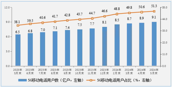 移動電話用戶規(guī)模穩(wěn)中有增,5G用戶數(shù)超9億戶。截至5月末,三家基礎(chǔ)電信企業(yè)及中國廣電的移動電話用戶總數(shù)達(dá)17.63億戶,比上年末凈增1953萬戶。其中,5G移動電話用戶達(dá)9.05億戶,比上年末凈增8292萬戶,占移動電話用戶的51.3%,占比較上年末提高4.7個百分點(diǎn)。