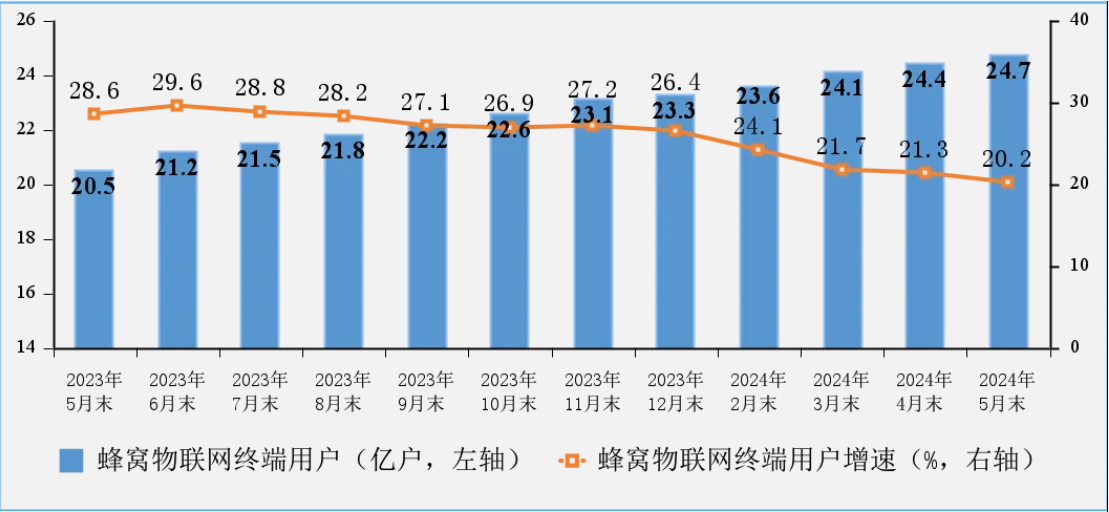 蜂窩物聯(lián)網(wǎng)用戶規(guī)模快速擴(kuò)張,IPTV(網(wǎng)絡(luò)電視)用戶穩(wěn)步增加。截至5月末,三家基礎(chǔ)電信企業(yè)發(fā)展蜂窩物聯(lián)網(wǎng)終端用戶24.65億戶,比上年末凈增1.33億戶,占移動網(wǎng)終端連接數(shù)(包括移動電話用戶和蜂窩物聯(lián)網(wǎng)終端用戶)的比重達(dá)58.3%。IPTV(網(wǎng)絡(luò)電視)總用戶數(shù)達(dá)4.04億戶,比上年末凈增259萬戶。
