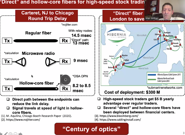南加州大學(xué)的Allan Willner教授分享了自由空間光通信及光信號處理的報(bào)告,他認(rèn)為自由空間光通信與射頻相比,光鏈路具有高方向性和大帶寬的特點(diǎn)。而自由空間鏈路可以利用從太赫茲到可見光的更寬的頻率范圍。OSP一直具有高速運(yùn)行和避免低效光-電-光轉(zhuǎn)換的前景。雖然OSP部署現(xiàn)階段受限,PIC、能效、多波長運(yùn)行的發(fā)展可能推動(dòng)OSP很快應(yīng)用于高性能功能。