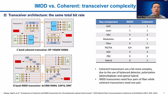 華中科技大學(xué)的唐明教授帶來了短距離自零差相干互連設(shè)備的前景和挑戰(zhàn)的分享,他認(rèn)為在相干與直檢兩大傳輸體系激烈博弈的今天,同源零差相干光傳輸架構(gòu)有希望較好的平衡成本與功耗,并與傳統(tǒng)相干光通信性能相媲美。他著重介紹了短距離自零差相干互連設(shè)備的關(guān)鍵技術(shù)及重要進(jìn)展。