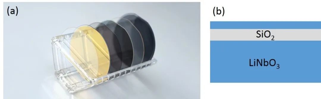 圖1 (a) 單晶鈮酸鋰薄膜晶圓和 (b) 橫截面示意圖