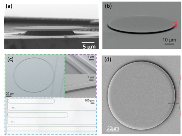 (c) 電子束曝光、氬離子刻蝕后鍍二氧化硅的微環(huán)腔;(d) 激光光刻、化學(xué)機(jī)械拋光刻蝕制備的微盤腔