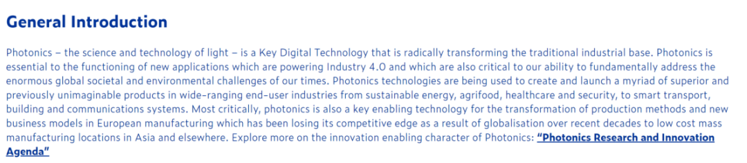 ●歐洲方面,早在2007年1月,歐美啟動第七個科技框架計劃,簡稱“FP7”,總預算為505.21億歐元。而光子學作為歐盟確定的六大關(guān)鍵勢能技術(shù)之一,“FP7”和“地平線2020”都將光子學技術(shù)重點投資領(lǐng)域,創(chuàng)新項目主要包括以下六個領(lǐng)域:新一代光子學技術(shù)、高速光纖因特網(wǎng)技術(shù)的研究開發(fā)、基于光子學技術(shù)的工業(yè)先進制造系統(tǒng)、高效激光加工工藝的開發(fā)、基于光子學技術(shù)的環(huán)境保護裝置、基于光子學技術(shù)在衛(wèi)生健康領(lǐng)域的應(yīng)用、基于光子學感應(yīng)技術(shù)在各領(lǐng)域的廣泛應(yīng)用。