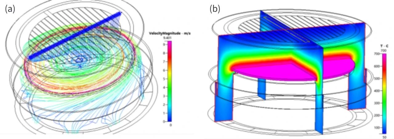 圖3 新型MOCVD設備反應腔模擬(a)流場均勻性模擬;(b)量子阱生長階段的溫場模擬
