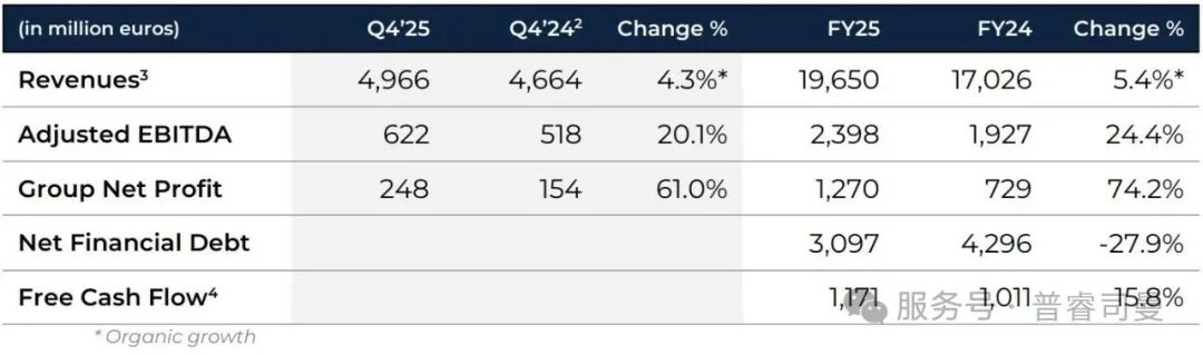 第四季度收入增至8.99億歐元(有機(jī)增長(zhǎng)+8.4%)。調(diào)整后EBITDA從2024年第四季度的1.19億歐元增至2025年第四季度的1.81億歐元。利潤(rùn)率顯著提升,達(dá)到行業(yè)最佳的20.9%(2024年第四季度為14.5%),提前三年實(shí)現(xiàn)2028年目標(biāo)。