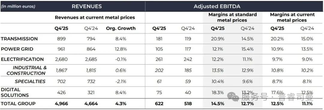 電網(wǎng)業(yè)務(wù)實(shí)現(xiàn)強(qiáng)勁增長(zhǎng)(由北美及歐洲驅(qū)動(dòng)),并取得穩(wěn)健盈利能力,盡管第四季度架空輸電線路業(yè)務(wù)的金屬溢價(jià)飆升帶來(lái)暫時(shí)性影響。