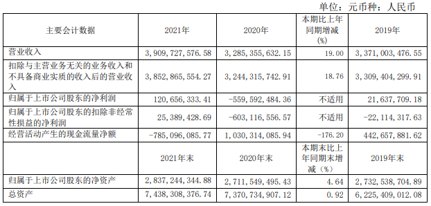 ICC訊 江蘇永鼎股份有限公司(簡稱永鼎股份)發(fā)布2021年度報告,報告期內(nèi),永鼎股份實現(xiàn)營業(yè)收入約39.10億元,同比增長19%,扣除與主營業(yè)務無關(guān)的業(yè)務收入和不具備商業(yè)實質(zhì)的收入后的營業(yè)收入為38.53億元,同比增長18.76%,歸屬上市公司股東的凈利潤為1.2億元。