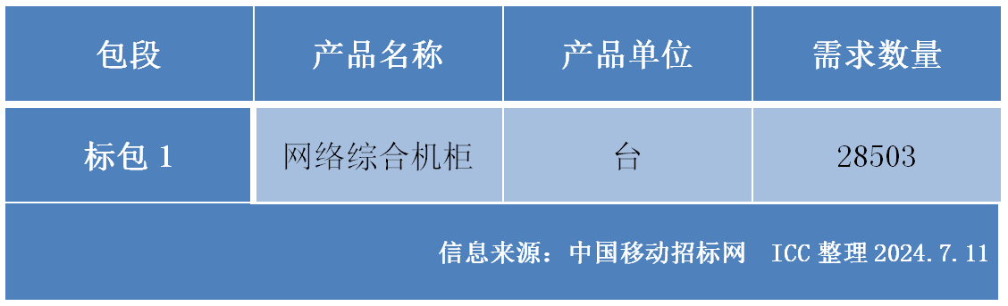 ICC訊 7月10日, 中國移動于官網發(fā)布招標公告,稱“中國移動2024年至2025年網絡綜合機柜產品集中采購”項目,資金已落實,已具備招標條件,現進行公開招標。