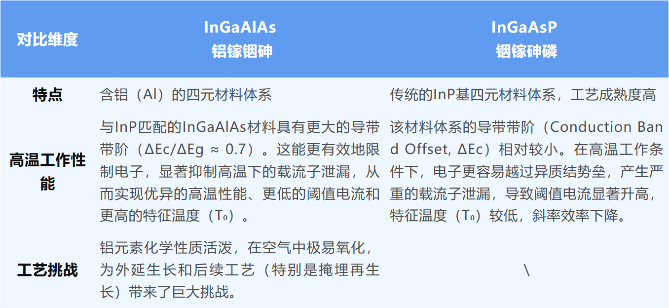 除了波導(dǎo)結(jié)構(gòu)設(shè)計(jì),有源區(qū)材料體系的選擇對(duì)激光器性能,尤其是高溫性能,起著決定性作用。目前,有兩種主流有源區(qū)材料:InGaAlAs (鋁鎵銦砷)和InGaAsP (銦鎵砷磷),下表對(duì)比了兩種材料體系的優(yōu)缺點(diǎn):